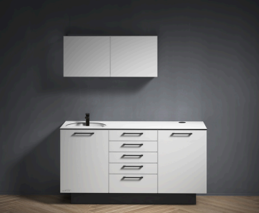 Waschbeckenschrank mit Frontauszug                                                                        Abfallbehälter und Bijou-Becken, Porzellan weiß                                                                    Inkl. Siphon und Schaftventil chrom